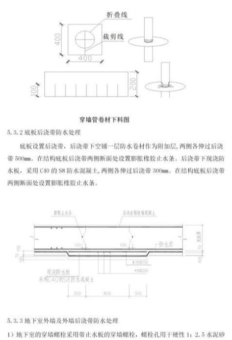 本工程的地下室防水采用Ⅰ级防水方案,主体结构选用抗渗自防水混凝土,防水卷材采用4 4厚SBS橡胶改性沥青防水卷材(Ⅱ型),采用热铺法铺贴。其中防水导墙部位采用外防内贴法施工。其他部位采用外防外贴法施工。