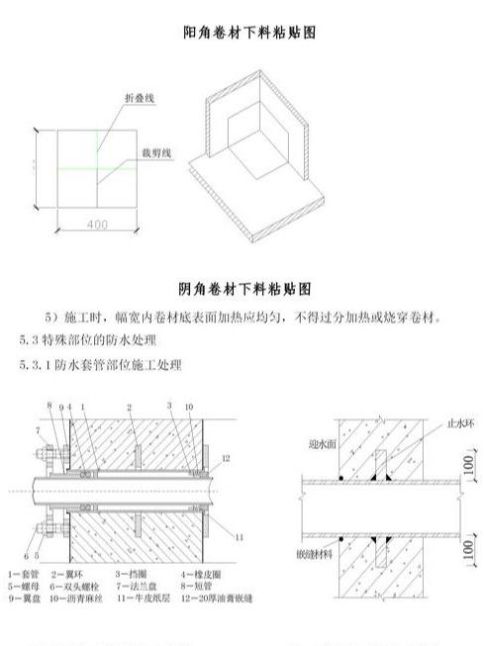 ③铺贴附加层:地下室底板的集水坑、电梯井等阴阳角、管子根、变形缝处等薄弱部位要铺贴于卷材相同的附加层,宽度不小于500mm.